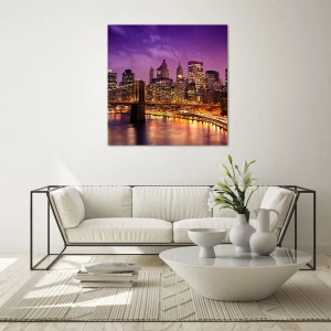 Obraz na szkle "Fioletowo-złoty Manhathann" to stylowa dekoracja, która przenosi do serca jednego z najbardziej ikonicznych miast na świecie. Centralnym elementem jest most Brookliński, rozciągający się nad wodą, z imponującą panoramą oświetlonych wieżowców na tle nocnego nieba. Fioletowo-niebieskie odcienie wieczornego nieba podkreślają nowoczesny charakter kompozycji i tworzą niezapomniany klimat.
