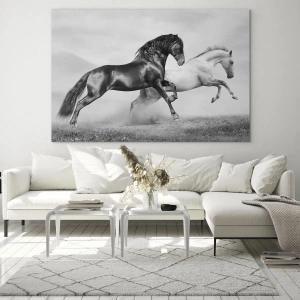 Obraz na szkle - Czarno-białe konie w dynamicznej scenerii - 100x70cm - Anioły i demony - Nowoczesna dekoracja ścienna do salonu, kuchni i sypialni ARTTOR