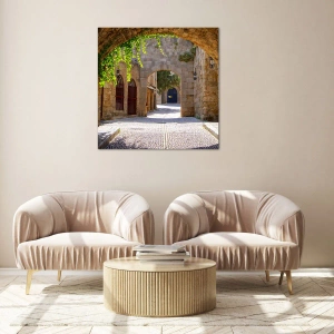 Obraz na szkle - Kamienne łuki i brukowane uliczki w średniowiecznym stylu - 80x120cm - Zaraz pojawi się orszak - Nowoczesna dekoracja ścienna do salonu i sypialni ARTTOR