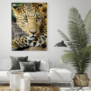 Obraz na szkle - Leopard odpoczywający na drewnianej powierzchni - 50x70cm - Nie bój się, podejdź - Nowoczesna dekoracja ścienna do salonu, kuchni i sypialni ARTTOR