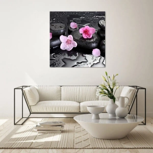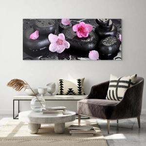 Obraz na szkle - Kamienie spa z kwiatami na mokrym tle - 50x70cm - I kamień spada z serca - Nowoczesna dekoracja ścienna do salonu, kuchni i sypialni ARTTOR