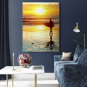 Obraz na szkle - Surfer idący po plaży o zachodzie słońca z deską w ręku - 120x50cm - Powrót wojownika - Nowoczesna dekoracja ścienna do salonu i sypialni ARTTOR