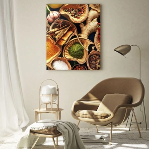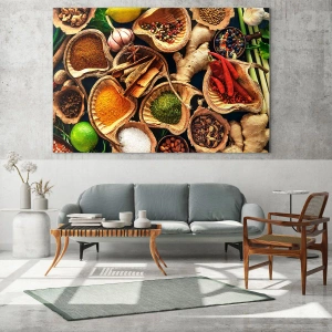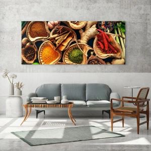 Obraz na szkle - Kolorowe przyprawy w naturalnych pojemnikach z dodatkami - 50x70cm - Bierz, co chcesz - Nowoczesna dekoracja ścienna do salonu, kuchni i sypialni ARTTOR