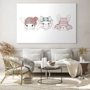 Obraz na szkle - Urocze króliczki w pastelowych nakryciach głowy - 80x120cm - Zamyślona, smutna, zadowolona - Nowoczesna dekoracja ścienna do salonu i sypialni ARTTOR