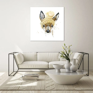 Obraz na szkle - Sarna w wełnianej czapce z pomponem - 50x70cm - Na zimę w śnieżnym lesie - Nowoczesna dekoracja ścienna do salonu, kuchni i sypialni ARTTOR