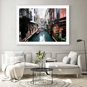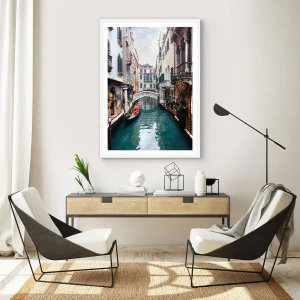 Plakat w białej ramie - Pejzaż wenecki z gondolą i mostkiem - 70x100 cm