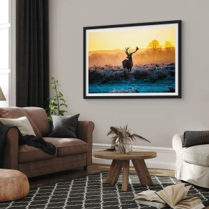 Plakat w czarnej ramie - Jeleń na mroźnej polanie o wschodzie słońca - 70x50cm - Koronowany na swoich włościach - Nowoczesna dekoracja ścienna do salonu i sypialni ARTTOR