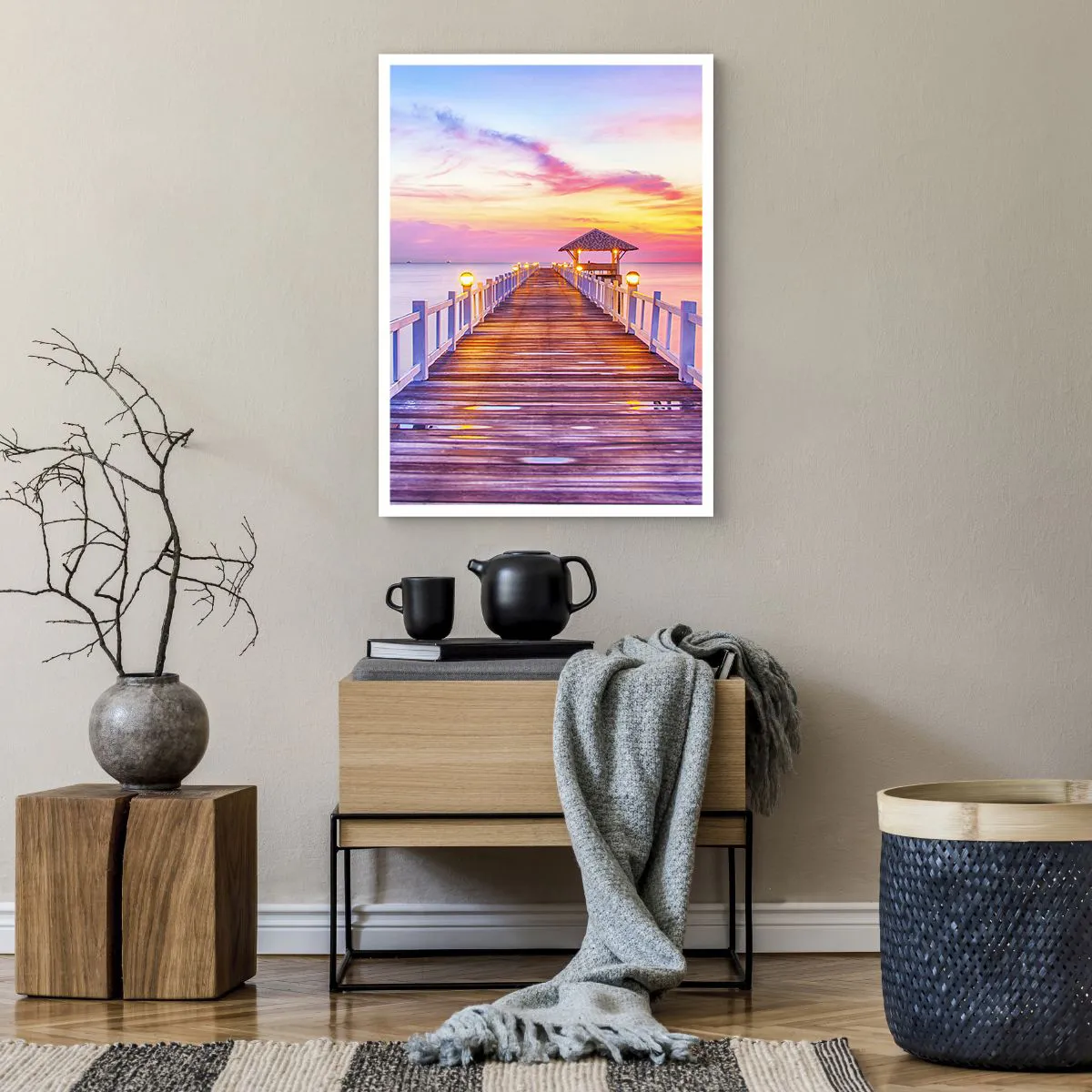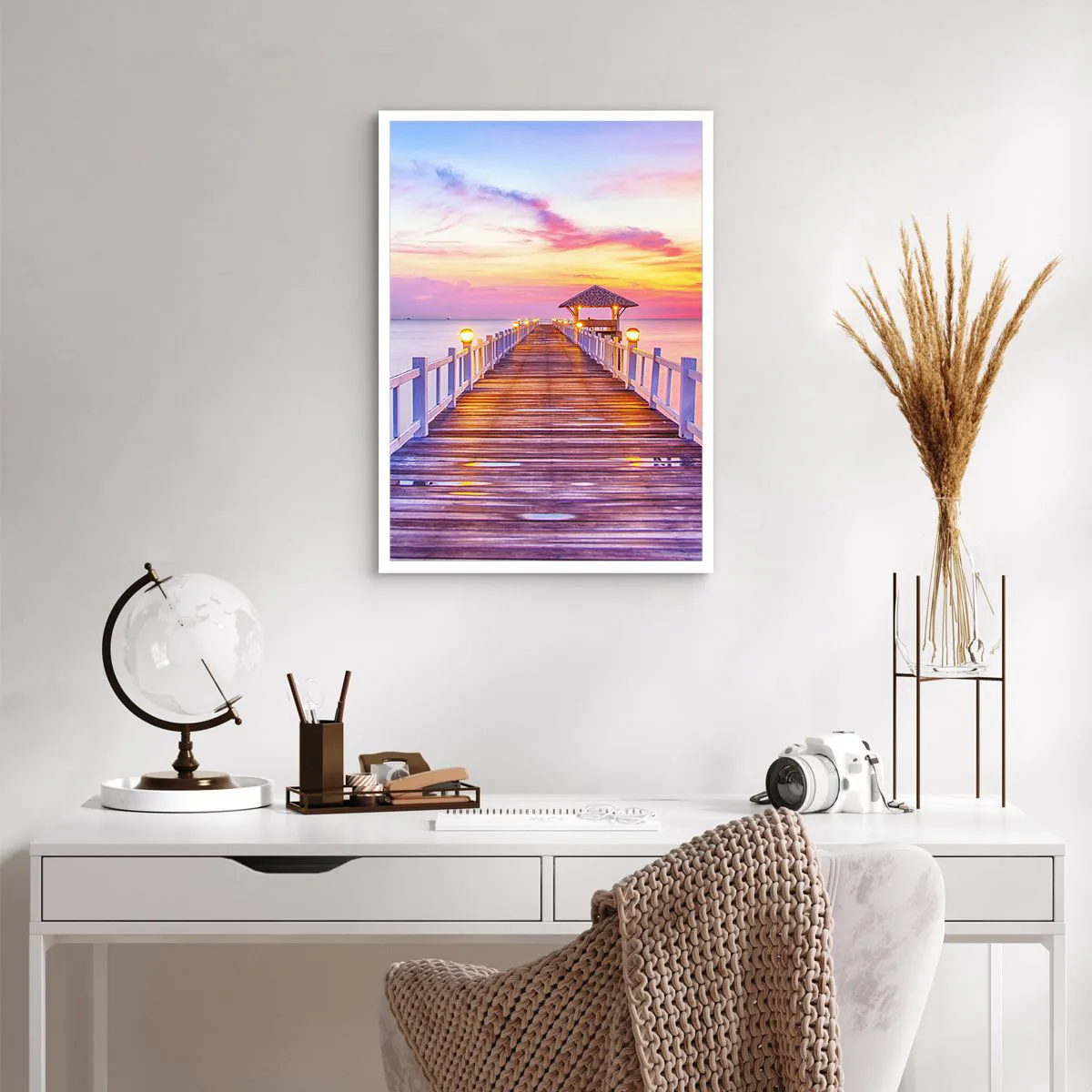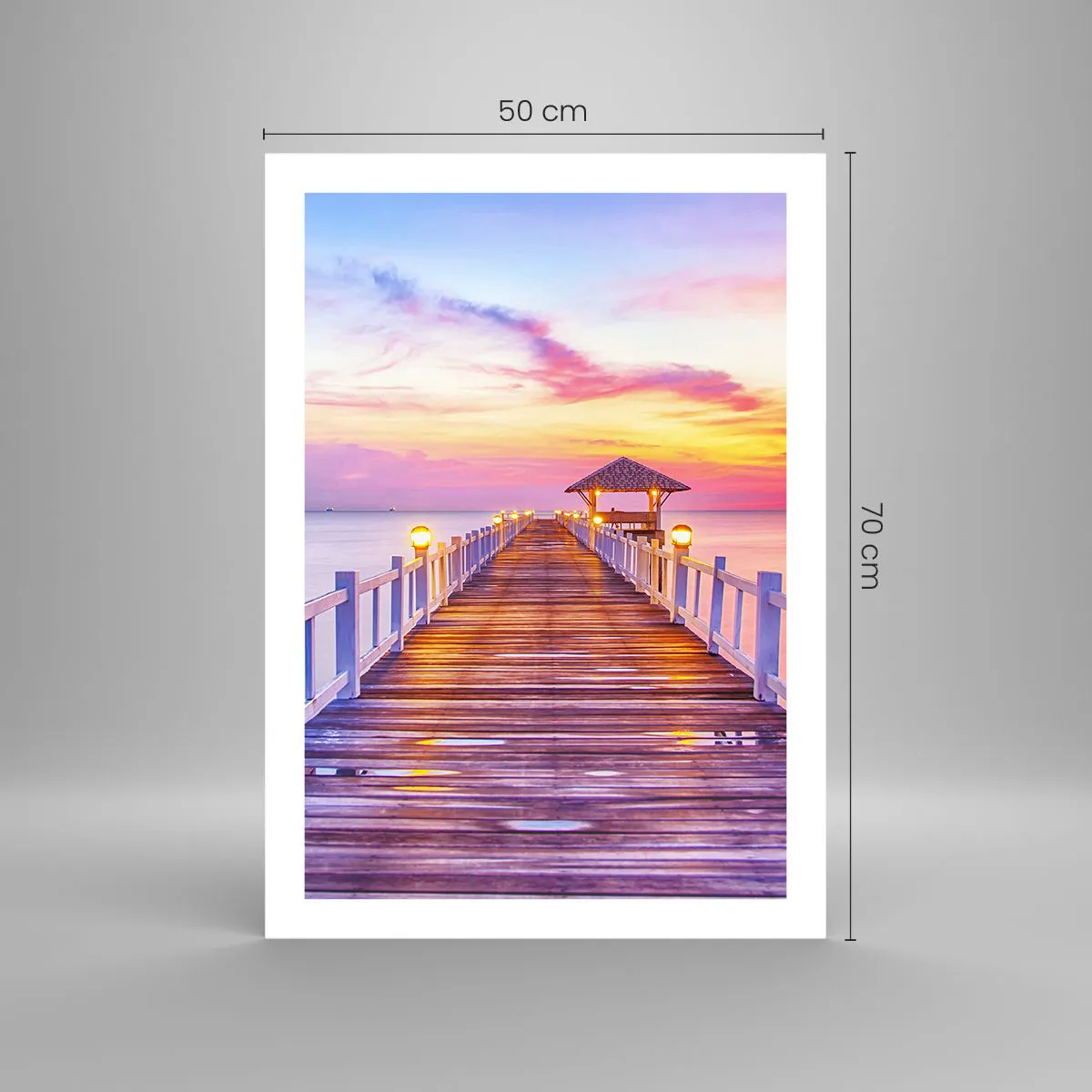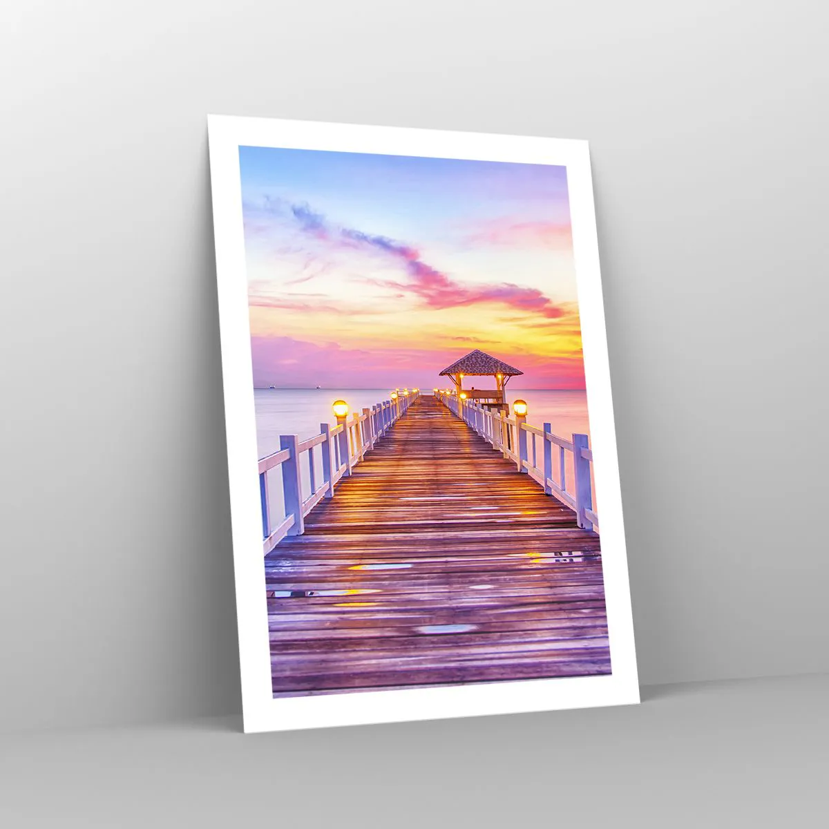 Plakat - Pomost z altaną oświetlony zachodzącym słońcem - 50x70cm - Liliowo-złota cisza wieczoru - Nowoczesna dekoracja ścienna do salonu, kuchni i sypialni ARTTOR