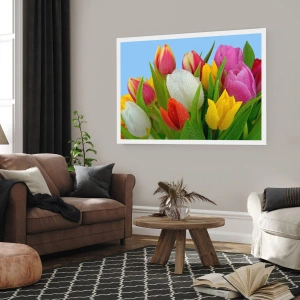 Plakat - Kolorowe tulipany pokryte kroplami rosy na błękitnym tle - 100x70cm - Kwiatowa tęcza w kroplach rosy - Nowoczesna dekoracja ścienna do salonu i sypialni ARTTOR