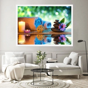 Plakat - Świece i ręcznik na tle naturalnego krajobrazu - 50x70cm - Czas dla ciała - Nowoczesna dekoracja ścienna do salonu, kuchni i sypialni ARTTOR