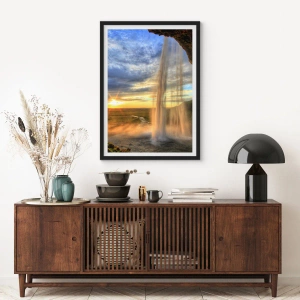 Plakat w czarnej ramie - Wodospad w świetle zachodzącego słońca na tle krajobrazu - 50x70cm - Świat za zasłoną kropel - Nowoczesna dekoracja ścienna do salonu i sypialni ARTTOR