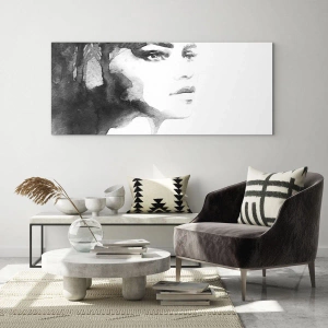 Obraz na szkle - Subtelny portret kobiety w odcieniach czerni i bieli - 70x100cm - Stworzona z tajemnicy i mgły - Nowoczesna dekoracja ścienna do salonu i sypialni ARTTOR