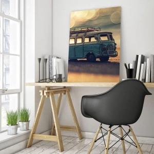 Obraz na szkle - Retro autobus na tle rozmytego światła - 160x50cm - Koniec bożków: pieniądza i pracy - Nowoczesna dekoracja ścienna do salonu i sypialni ARTTOR