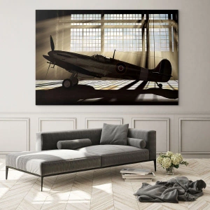 - Obraz na szkle przedstawiający samolot wojskowy w hangarze w grze światła i cieni. Idealny wybór dla miłośników historii wojennej i lotnictwa.