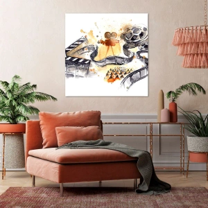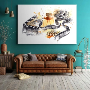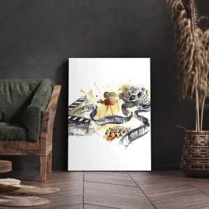 - Obraz przedstawia filmowe motywy, takie jak taśma, kamera i klaps w artystycznej akwareli. Stylowy dodatek dla miłośników kina i unikalnych dekoracji.