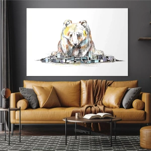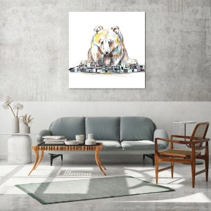 Obraz na szkle - Niedźwiedź patrzący na miasto w artystycznej kompozycji - 50x70cm - Jak można tak żyć? - Nowoczesna dekoracja ścienna do salonu, kuchni i sypialni ARTTOR