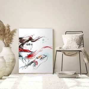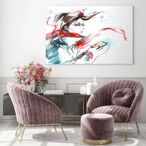 Obraz na szkle - Kobieta w czerwonym szalu z dynamicznymi, szkicowymi detalami - 50x70cm - Coś we mnie gra - Nowoczesna dekoracja ścienna do salonu, kuchni i sypialni ARTTOR