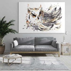 Obraz na szkle - Sowa z artystycznymi piórami w odcieniach pomarańczu i szarości - 50x70cm - Przybyła ze świata magii - Nowoczesna dekoracja ścienna do salonu, kuchni i sypialni ARTTOR