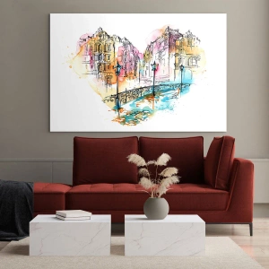 Obraz na szkle - Romantyczne kamienice z mostem w kształcie serca, akwarela - 50x70cm - Serce miasta - Nowoczesna dekoracja ścienna do salonu, kuchni i sypialni ARTTOR