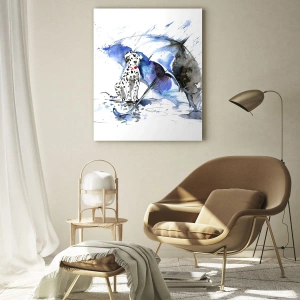 Format o wymiarach 70x50 cm w układzie poziomym doskonale komponuje się z przestrzeniami takimi jak salon, sypialnia czy biuro. Motyw dalmatyńczyka w deszczowej scenerii wprowadza naturalny akcent i inspirację do każdego wnętrza.