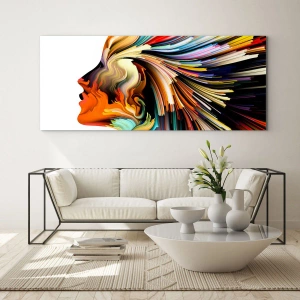 Obraz na szkle - Abstrakcyjny profil twarzy z kolorowymi dynamicznymi liniami - 160x50cm - Eksplozja wyobraźni - Nowoczesna dekoracja ścienna do salonu i sypialni ARTTOR