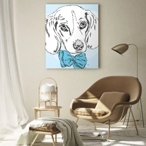 Obraz na szkle - Rysunek psa z muszką na niebieskim tle - 50x70cm - Psia elegancja - Nowoczesna dekoracja ścienna do salonu, kuchni i sypialni ARTTOR