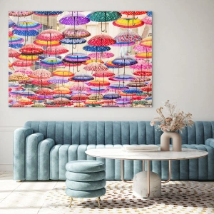 Obraz na szkle - Fotografia przedstawiająca kolorowe parasole zawieszone w powietrzu - 120x80cm - Miejska łąka - Nowoczesna dekoracja ścienna do salonu, kuchni i sypialni ARTTOR