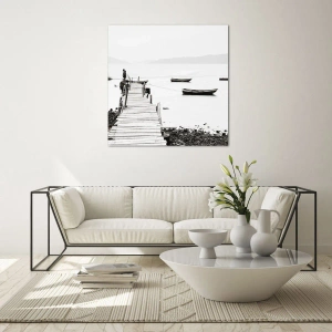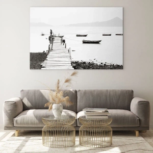 Obraz na szkle - Drewniane molo i łodzie na spokojnej wodzie - 70x100cm - Nad wodą cichą i czystą - Nowoczesna dekoracja ścienna do salonu i sypialni ARTTOR