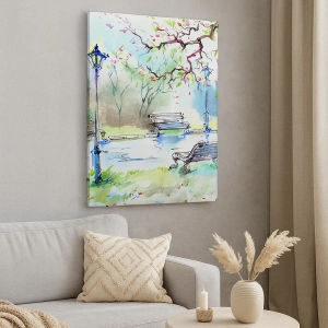 Obraz na płótnie - Akwarelowa scena parku z ławkami i lampami - 120x80cm - Czar parkowej ciszy - Nowoczesna dekoracja ścienna do salonu, kuchni i sypialni ARTTOR