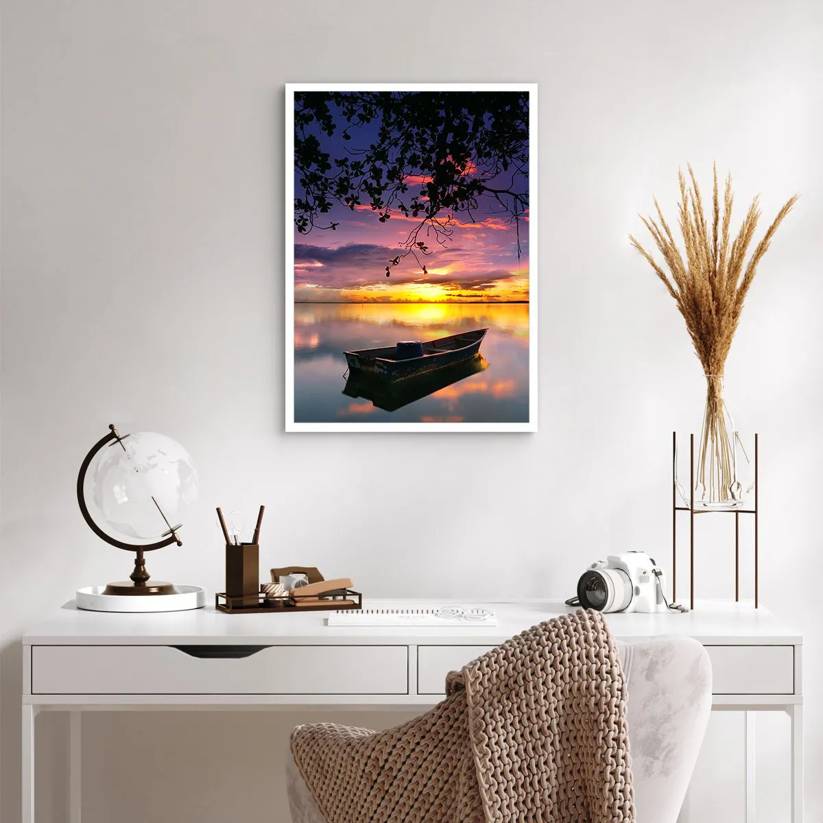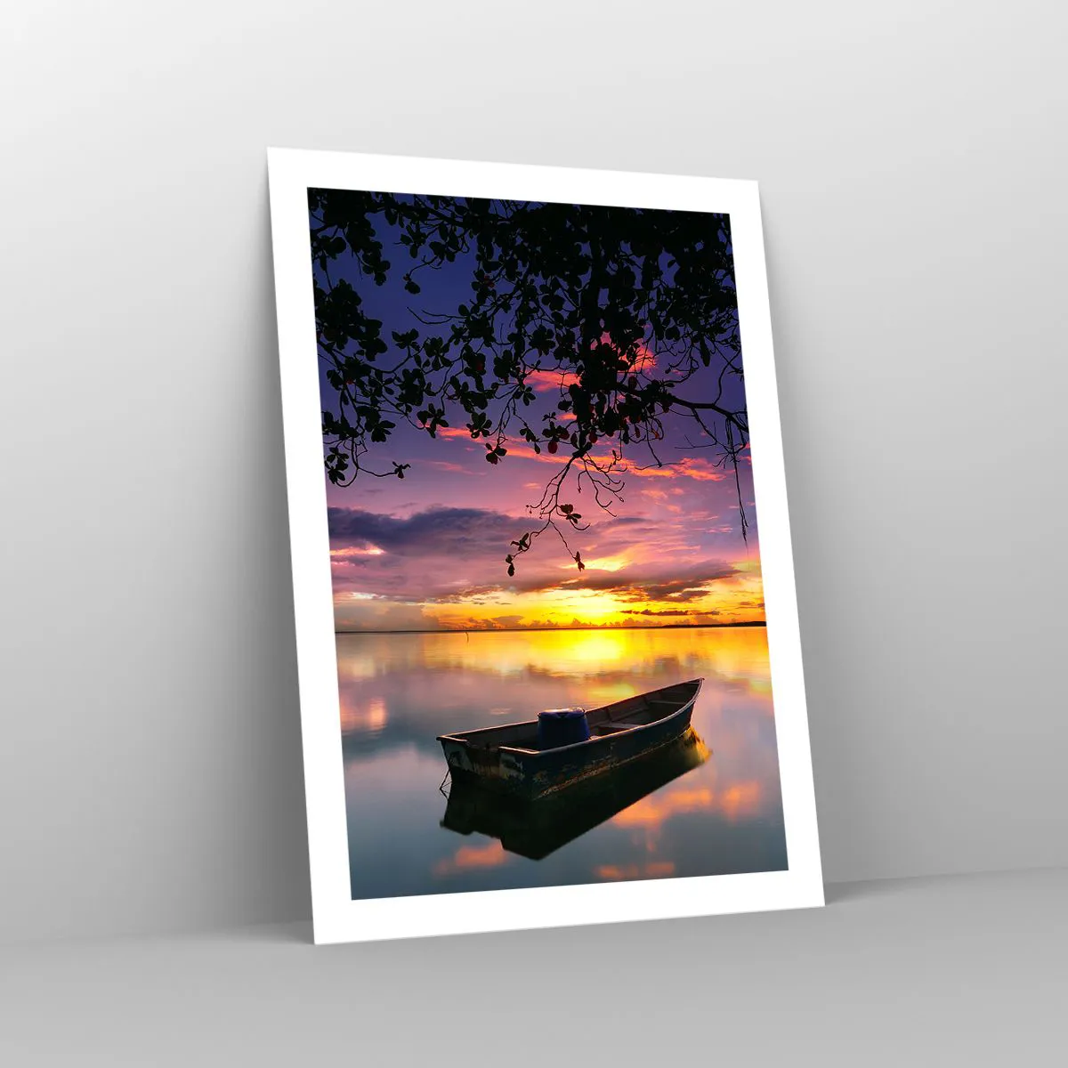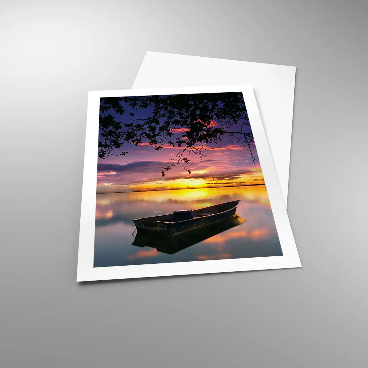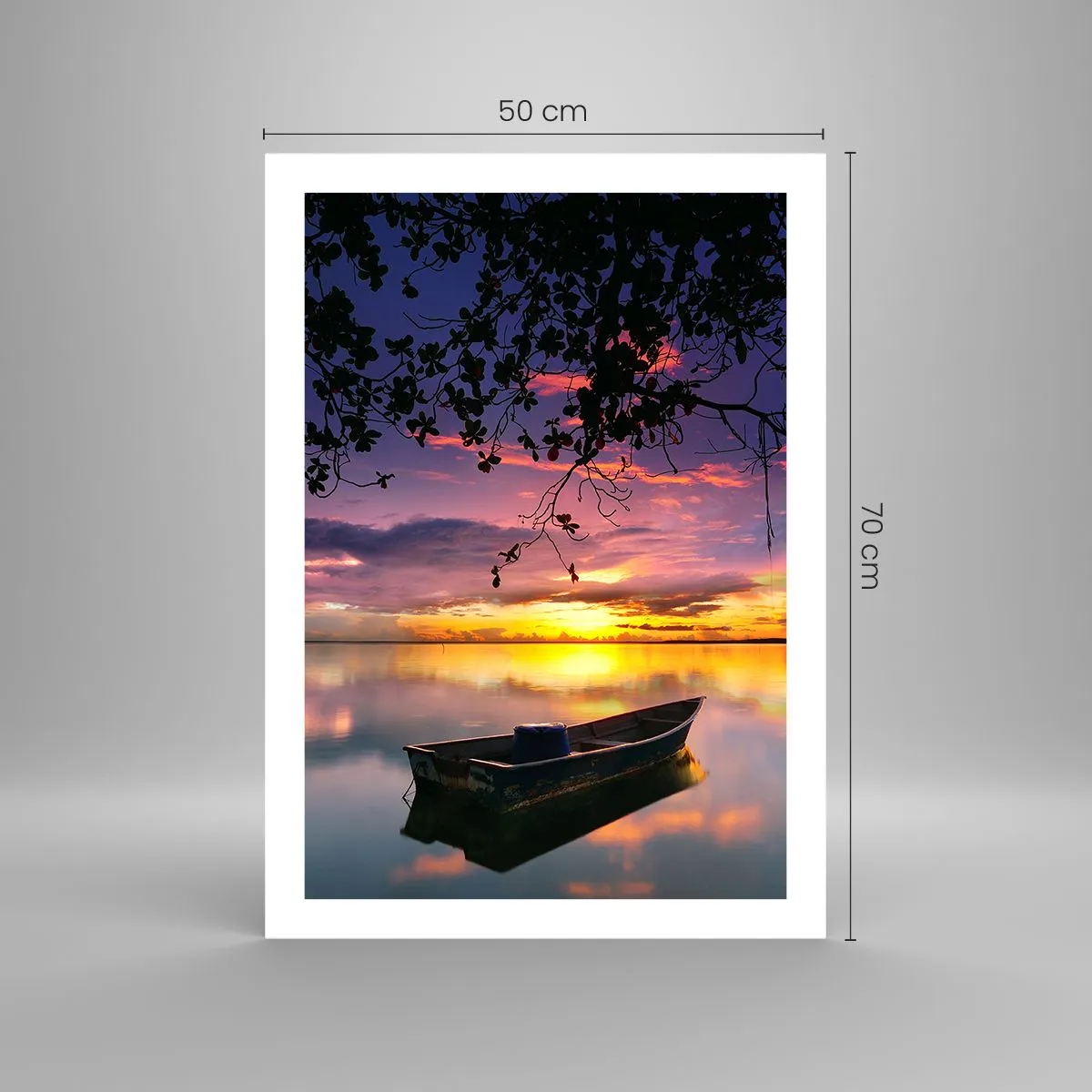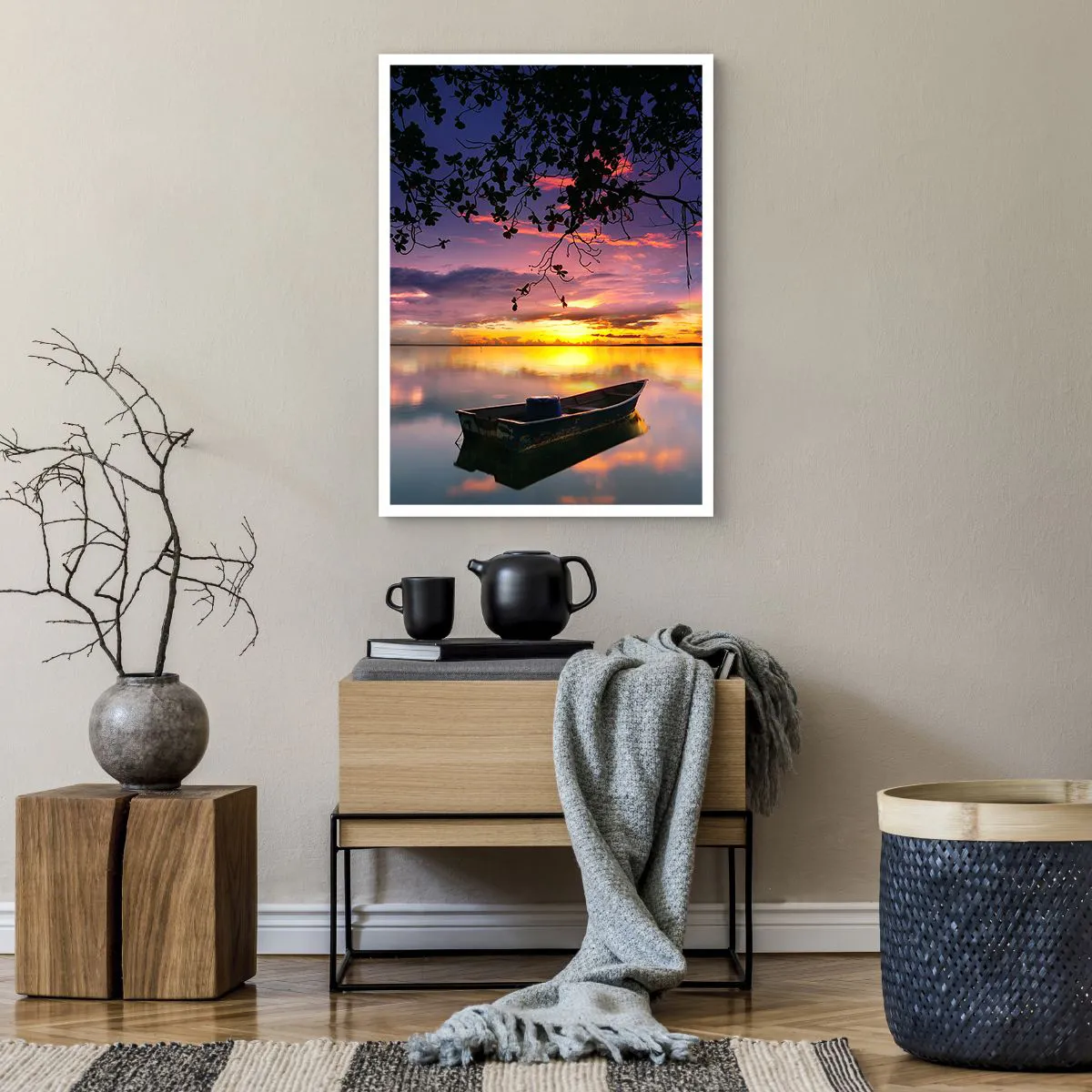 Plakat - Łódź na spokojnym jeziorze o zachodzie słońca - 50x70cm - "Zdajesz się wisieć w środku niebokręga…" - Nowoczesna dekoracja ścienna do salonu, kuchni i sypialni ARTTOR