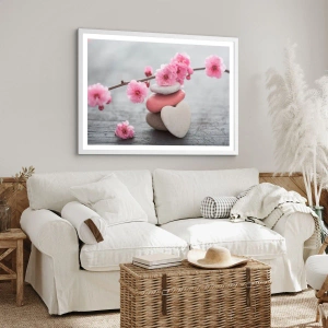 Plakat w białej ramie - Błogość z kwiatem wiśni - 70x100 cm