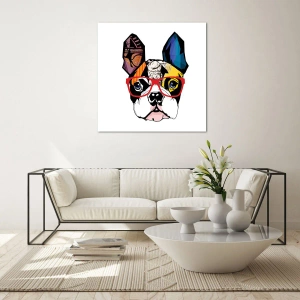 Obraz na szkle - Bulldog w kolorowych okularach na białym tle - 50x70cm - Intelektualista - Nowoczesna dekoracja ścienna do salonu, kuchni i sypialni ARTTOR