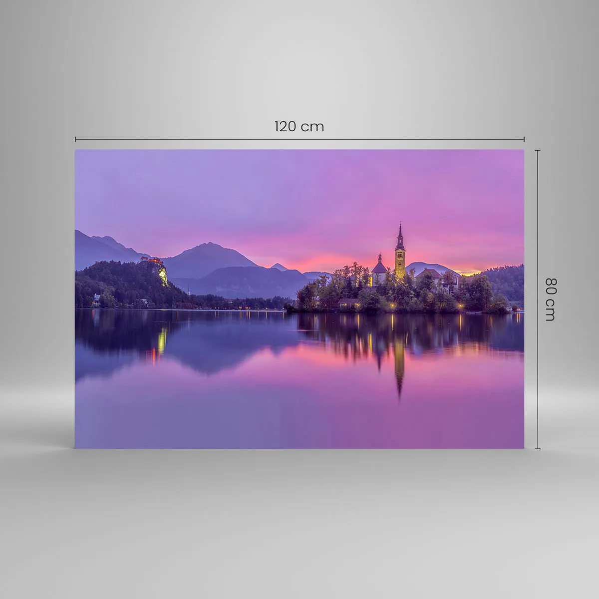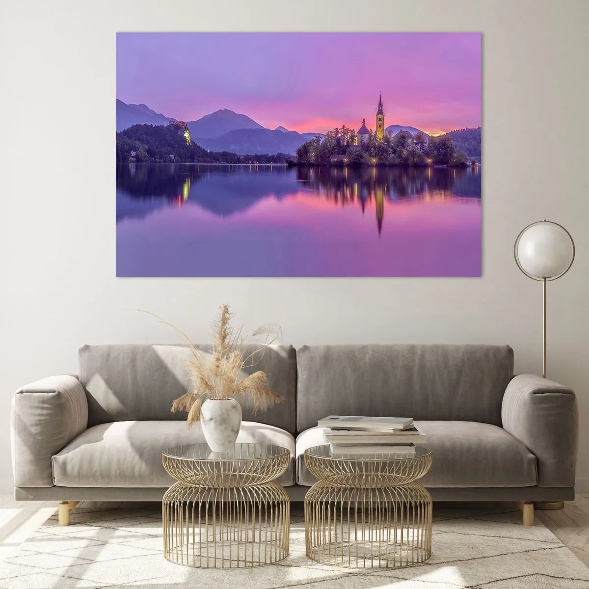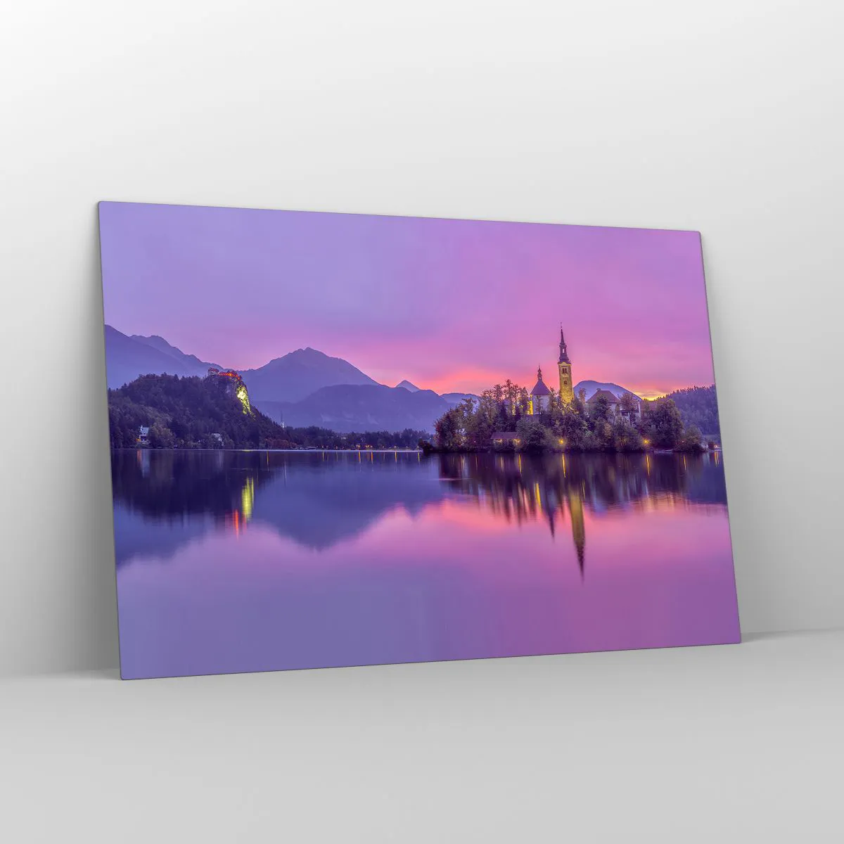 Obraz na szkle - Kościół na wyspie na tle gór i zachodu słońca - 120x80cm - Bajkowa wyspa o zmierzchu - Nowoczesna dekoracja ścienna do salonu, kuchni i sypialni ARTTOR