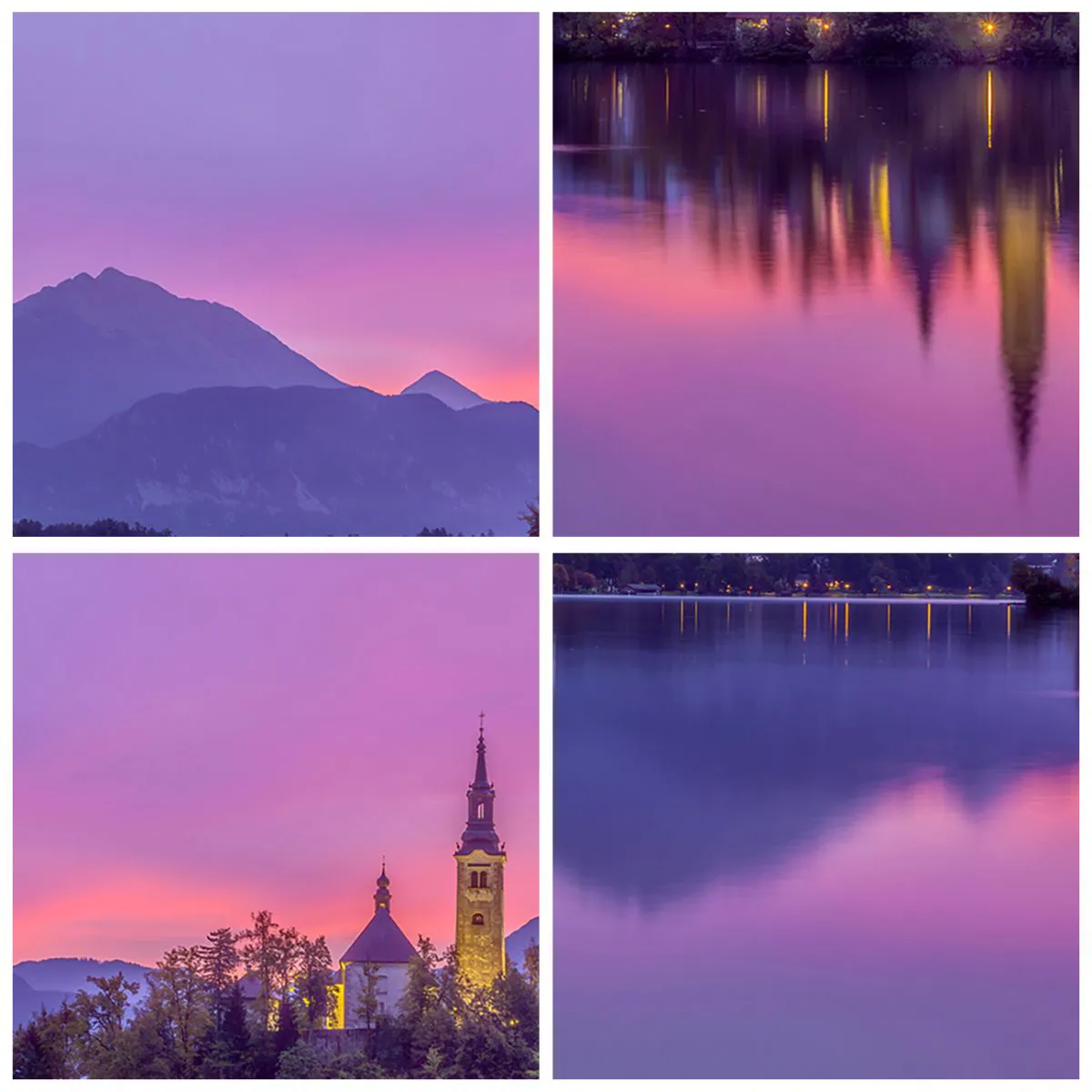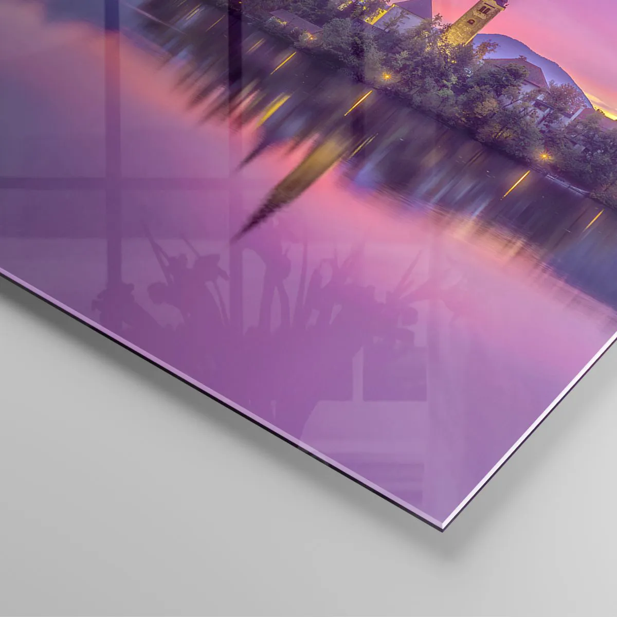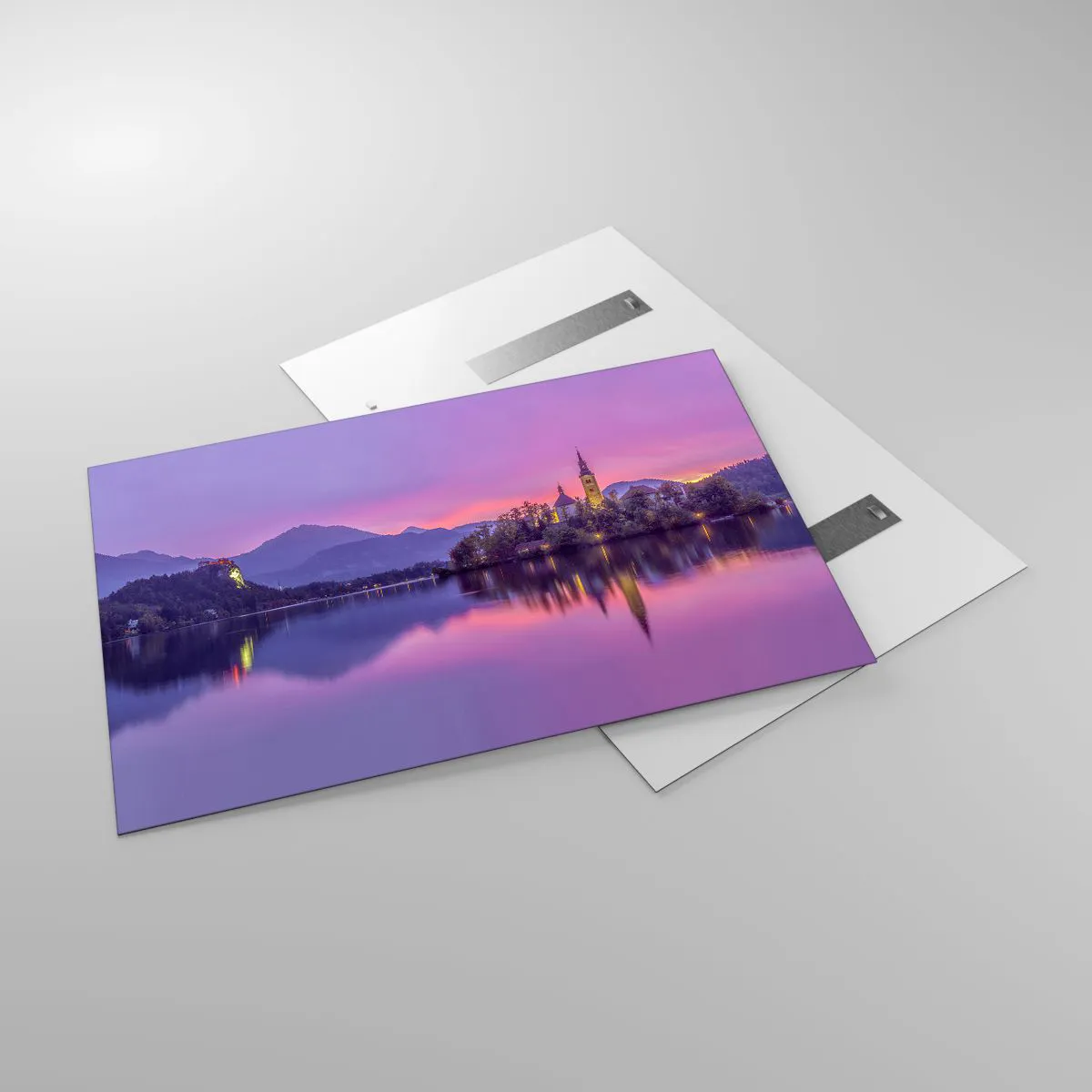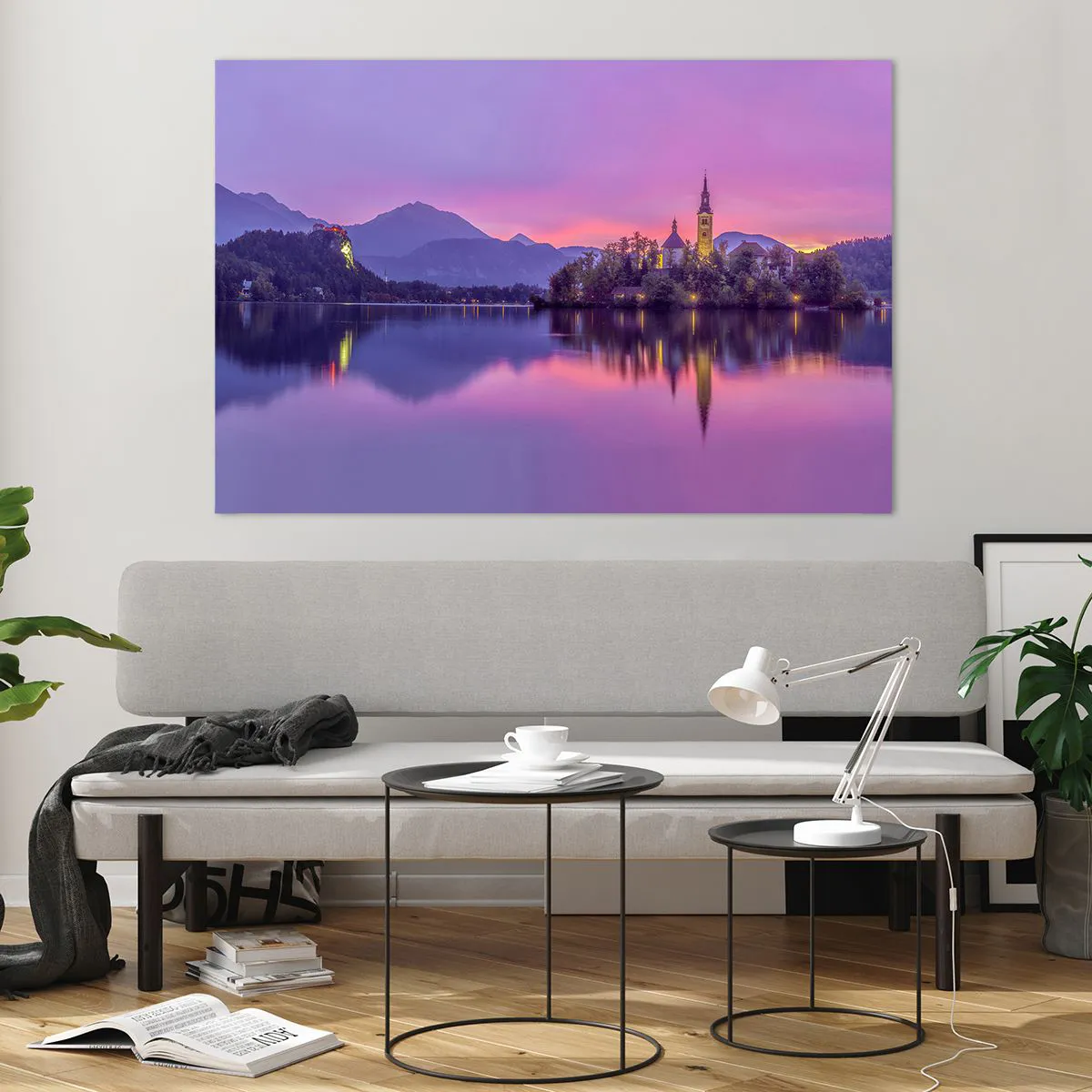 Obraz na szkle - Kościół na wyspie na tle gór i zachodu słońca - 120x80cm - Bajkowa wyspa o zmierzchu - Nowoczesna dekoracja ścienna do salonu, kuchni i sypialni ARTTOR