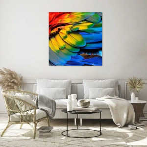 Obraz na szkle "Kolorowe pióra papugi" to niezwykle intensywne i dynamiczne dzieło, które przyciąga wzrok swoją wyjątkową paletą barw. Pióra papugi ukazane w żywych odcieniach tęczy, od głębokich błękitów po intensywne czerwienie, tworzą harmonijną i egzotyczną kompozycję.
