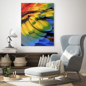 - Obraz przedstawiający intensywnie kolorowe pióra papugi, ukazujące pełnię barw tęczy. Idealny do wnętrz w stylu tropikalnym lub nowoczesnym.