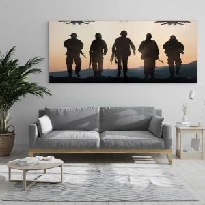 - Dynamiczny obraz ukazujący sylwetki żołnierzy na tle zachodzącego słońca z przelatującymi odrzutowcami. Scena pełna symboliki i mocy, idealna jako dodatek do wnętrz o nowoczesnym lub militarnym charakterze.