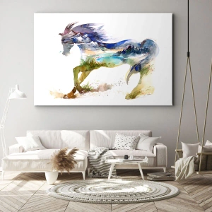 Obraz na płótnie - Akwarela konia z krajobrazem górskim w sylwetce - 120x80cm - Z łąki wprost do nieba - Nowoczesna dekoracja ścienna do salonu, kuchni i sypialni ARTTOR