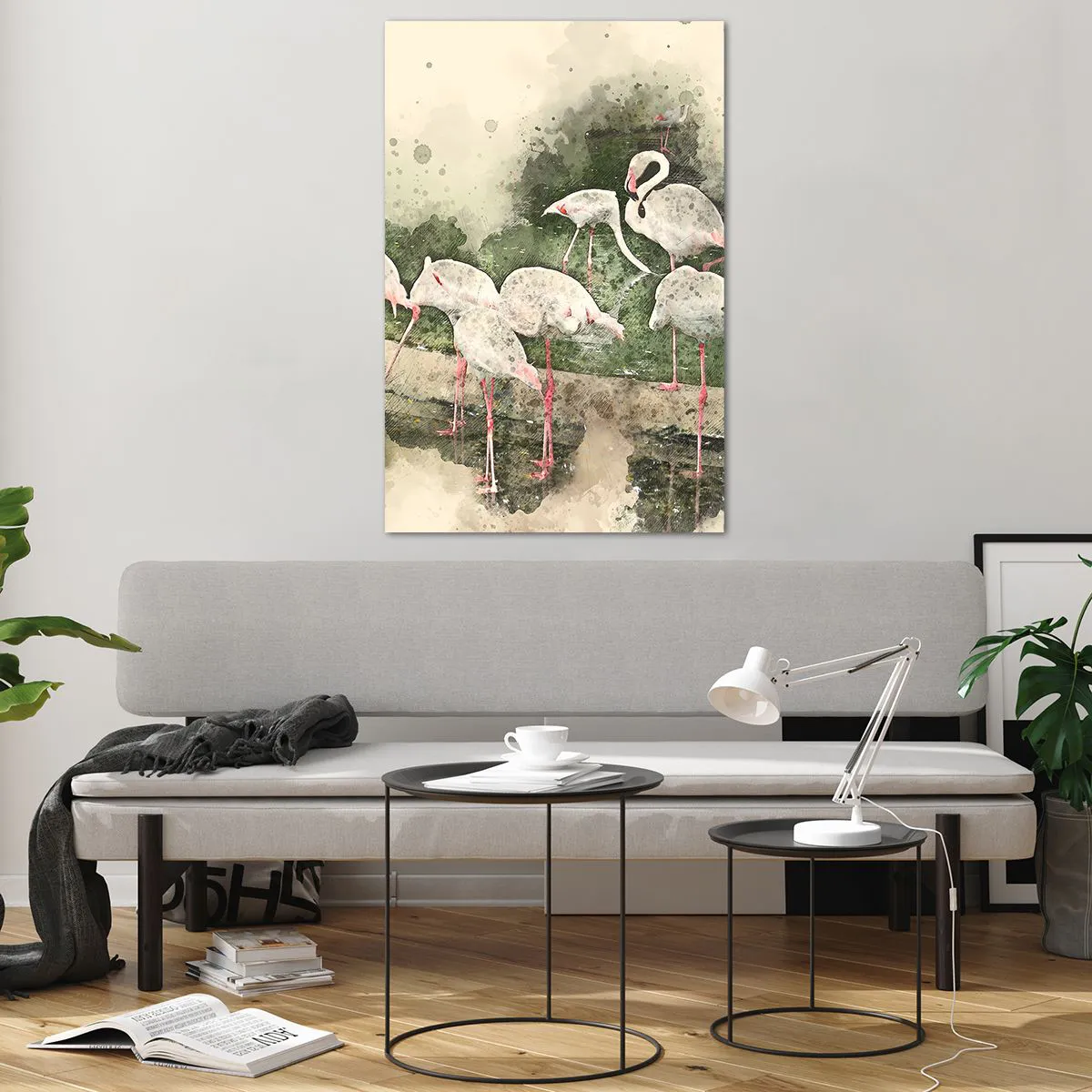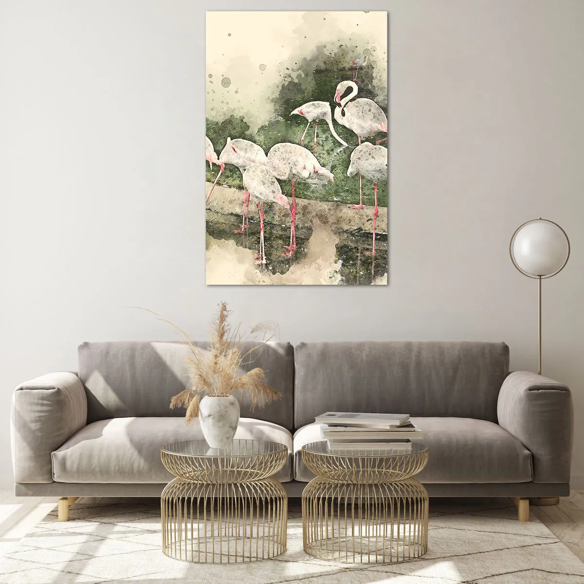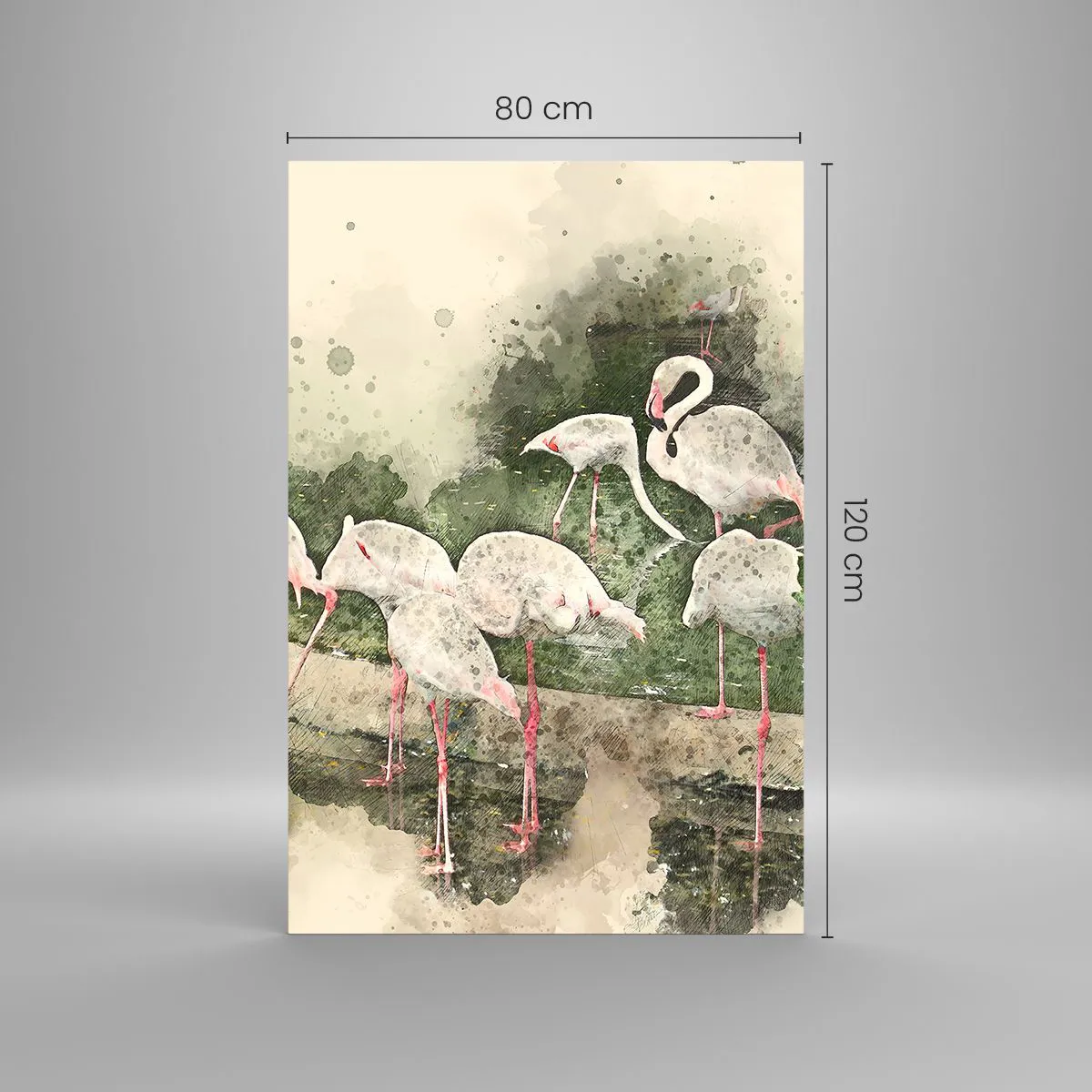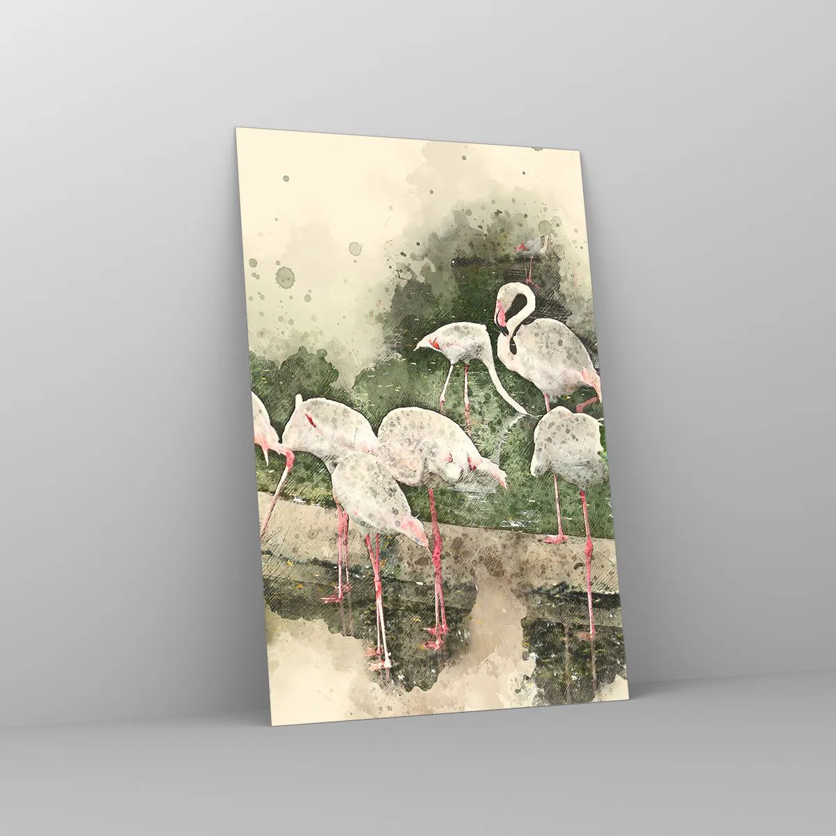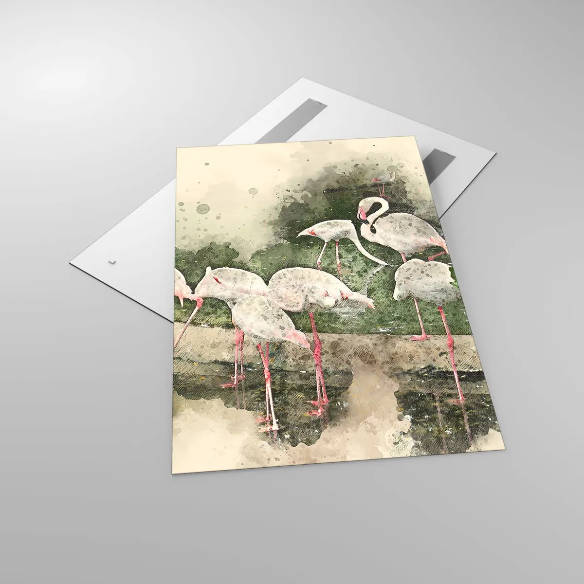 Obraz na szkle - Flamingi w naturalnym otoczeniu w akwarelowym stylu - 80x120cm - Egzotyczny sen - Nowoczesna dekoracja ścienna do salonu i sypialni ARTTOR