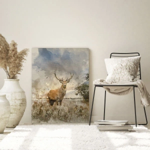 Obraz na szkle - Jeleń w naturalnym otoczeniu w akwarelowym stylu - 160x50cm - Godność - siła - dostojeństwo - Nowoczesna dekoracja ścienna do salonu i sypialni ARTTOR