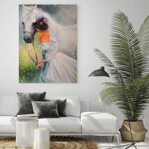 • Obraz przedstawia kobietę w białej sukni z białym koniem na kwiecistej łące, pełnej delikatności i romantycznej atmosfery. Idealna dekoracja, która wprowadza do wnętrza spokój i naturalne piękno.