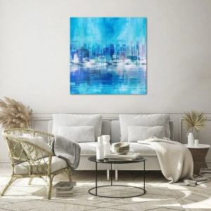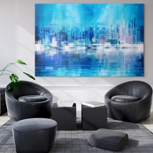 Obraz na szkle - Nowoczesna panorama miasta w odcieniach błękitu - 50x70cm - Zatopione w błękicie - Nowoczesna dekoracja ścienna do salonu, kuchni i sypialni ARTTOR