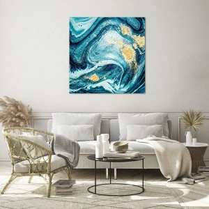 Kompozycja obrazu to dynamiczne wiry i fale, które zdają się poruszać na szklanej powierzchni. Połączenie turkusowych barw z połyskującymi akcentami złota nadaje całości elegancji i wyrazistości. Detale obrazu zostały starannie zaprojektowane, by stworzyć efekt głębi i ruchu, który hipnotyzuje i wprowadza widza w świat nowoczesnej sztuki.