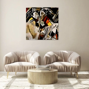 Kompozycja obrazu łączy dynamiczne linie i zgeometryzowane formy, tworząc harmonijną całość. Wyraziste kontrasty między ciepłymi odcieniami żółci i czerwieni a stonowanymi barwami bieli i czerni nadają dziełu głębi i wyjątkowego charakteru. Każdy detal obrazu przyciąga uwagę i inspiruje, wprowadzając widza w świat nowoczesnej sztuki abstrakcyjnej.