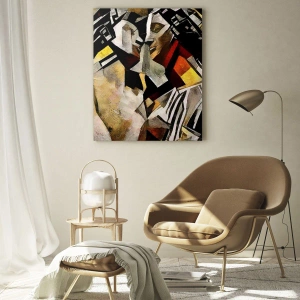 "Posągowy pocałunek" to obraz na szkle o wymiarach 70x50 cm, który ukazuje abstrakcyjną interpretację pary w geometrycznych wzorach i bogatej palecie kolorów. To dzieło sztuki, które wprowadza nowoczesny akcent i artystyczny wyraz do każdego wnętrza.