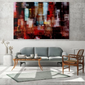 - Obraz przedstawia abstrakcyjną kompozycję geometryczną w dominujących odcieniach czerwieni i czerni. Strukturalne detale i dynamiczne formy tworzą nowoczesną, pełną kontrastu dekorację wnętrza.