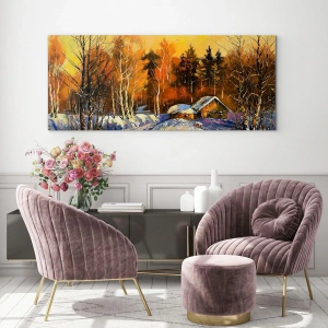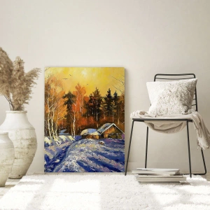 Obraz na szkle - Zimowy krajobraz z domem w świetle zachodzącego słońca - 80x120cm - Zimowa impresja w słońcu - Nowoczesna dekoracja ścienna do salonu i sypialni ARTTOR