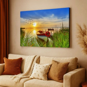 Obraz na płótnie - Łódka przy brzegu jeziora o zachodzie słońca - 100x70cm - Kormorany odlatują już - Nowoczesna dekoracja ścienna do salonu, kuchni i sypialni ARTTOR