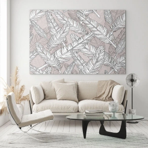 Obraz na szkle "Pierzasta zawierucha" to wyjątkowa kompozycja czarno-białych liści bananowca przedstawionych na subtelnym, beżowym tle. Precyzyjny graficzny wzór wprowadza do wnętrza harmonię i nowoczesny styl, idealny dla osób ceniących minimalistyczne rozwiązania dekoracyjne.