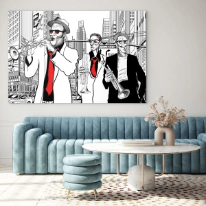 Obraz na szkle - Jazzowy zespół uliczny w nowoczesnym stylu graficznym - 50x70cm - Miejska rapsodia w czerni i czerwieni - Nowoczesna dekoracja ścienna do salonu, kuchni i sypialni ARTTOR